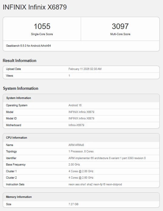 An upcoming Infinix phone with the model number X6879 has appeared on Geekbench. This device was previously spotted on an Indonesian certification platform with the Infinix Note 60 branding.