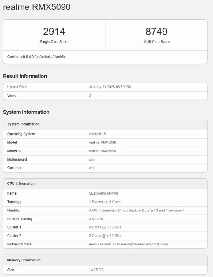 Realme’s upcoming GT 7 smartphone has emerged in benchmark and certification listings, disclosing important specifications. A Geekbench entry, identified by MySmartPrice, indicates that the device (model number RMX5090) achieved a score of 2,914 in single-core tests and 8,749 in multi-core tests.
