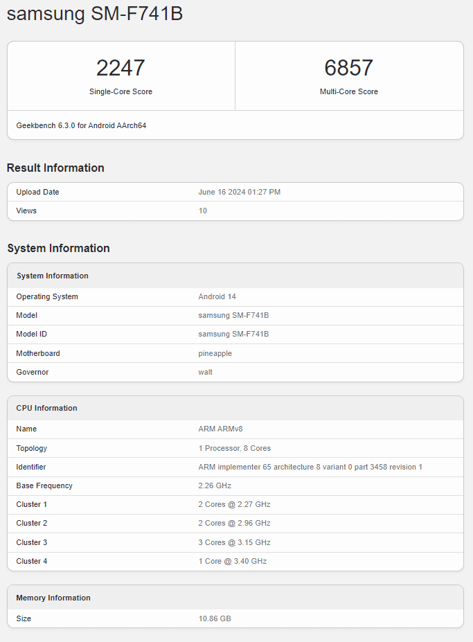 Tipster @tarunvats33 spotted the Geekbench listing, which highlights details of the Exynos 2500 processor. The device scored 2,356 points in single-core and 8,076 in multi-core tests. For comparison, the Snapdragon 8 Gen 3 chip in the Galaxy Z Flip6 scored 2,247 and 6,857 in the same tests.